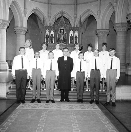Interiör av Olaus Petrikryka, konfirmation, sex flickor, sex pojkar och en präst.