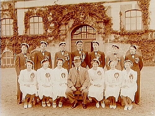 Realklass utanför skolan, 13 skolelever med lärare Palmblad.
