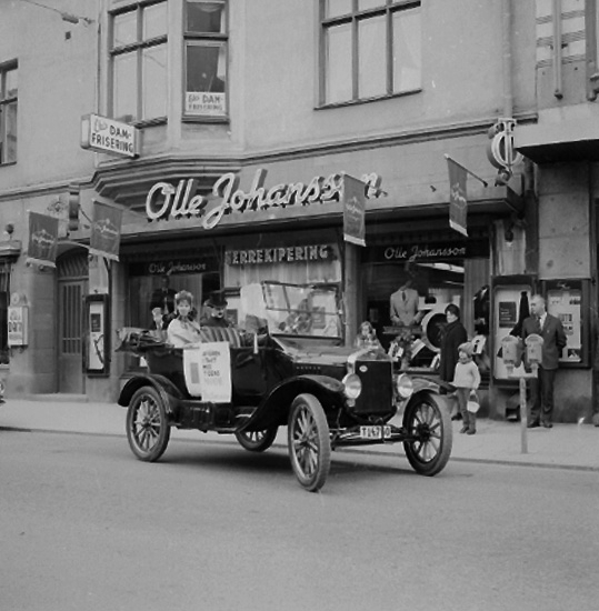 Titel: Olle Johansson AB, affärsbyggnad, skyltfönster. Bil med reklamtexten: "Affären i takt med tidens mode. AB Olle Johansson herr-junior".