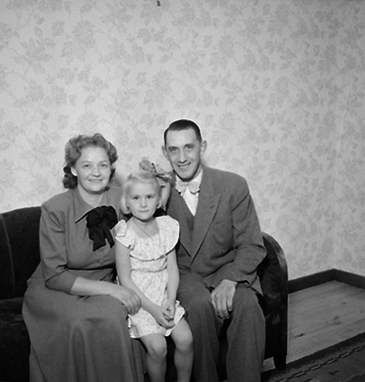 Rumsinteriör, familjegrupp tre personer.