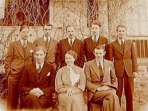 På Rehnhults 20 årsdag, 8 ungdomar. Stående från vänster: Pusse Södergren, Sidney Björk, Bengt Källin, Valter Holmström och jag (Sven Lindskog). Sittande från vänster: Nils Sundkvist, Iris Sundkvist och Stig Rehnhult.