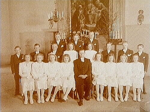 19 konfirmander, 10 flickor, 9 pojkar och kyrkoherde Gabriel Carlsten.