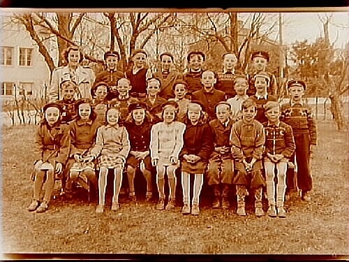 Almby Östra skola, 6 flickor, 18 pojkar med lärarinna fröken Gerd Holmer, på skolgården.