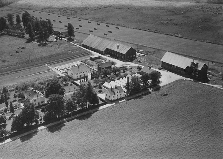 Flygfoto över Backa gård, Pålsboda, bostadshus och ekonomibyggnader.