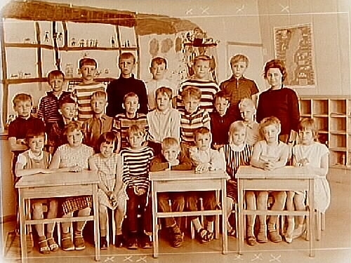 23 skolbarn och lärarinna fröken Astrid Lindlöf.