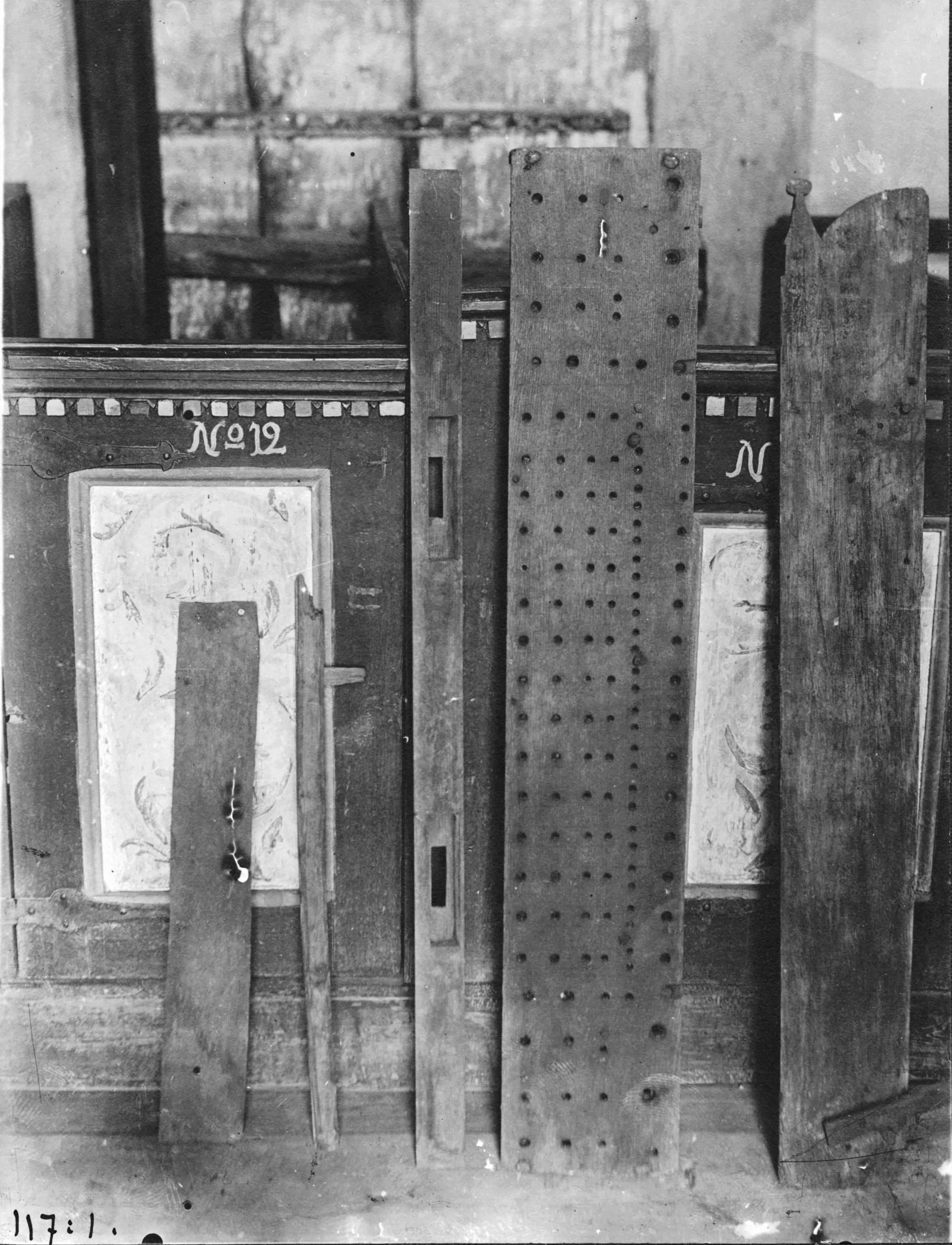 Rester av medeltida träorgel. Plåt 117:1 krossad.