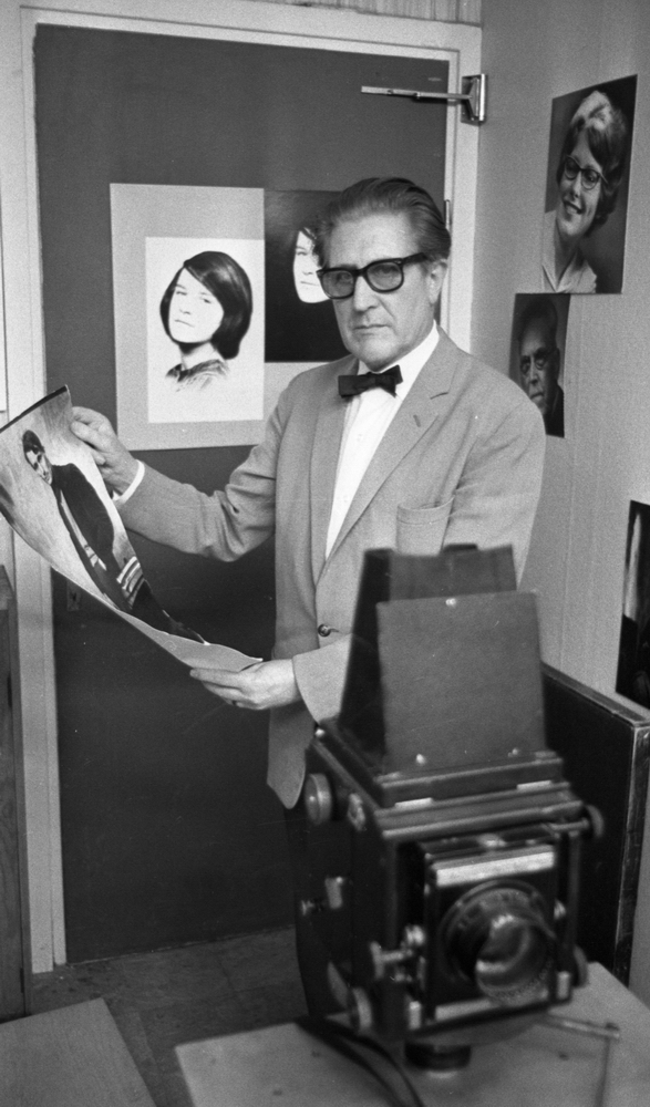 I förgrunden står en stor kamera. Bakom den står en man klädd i ljus kavaj, vit skjorta med svart fluga samt mörka byxor. Han bär glsögon. I händerna håller han ett foto föreställande en man. På väggarna hänger ytterligare bilder.