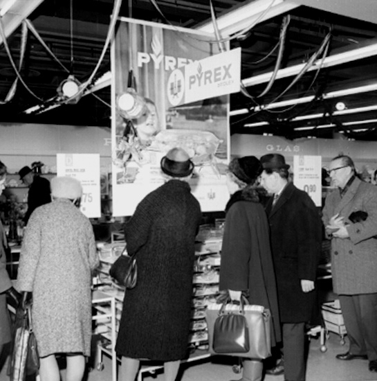 Titel: Konsum Domus, affärsinteriör, kunder och personal, demonstration av Pyrex-produkter.