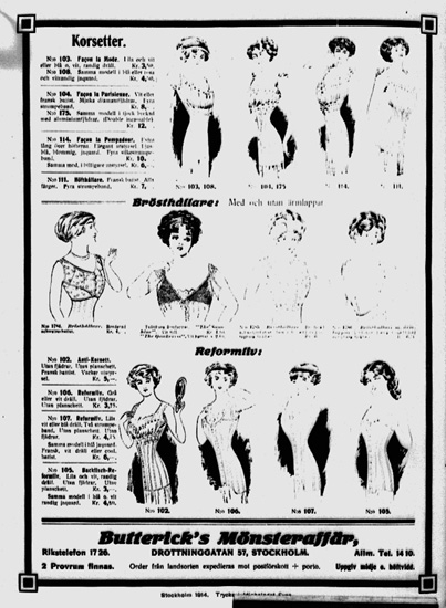 Damunderkläder från Butterick's Mönsteraffär, Drottninggatan 57, Stockholm.