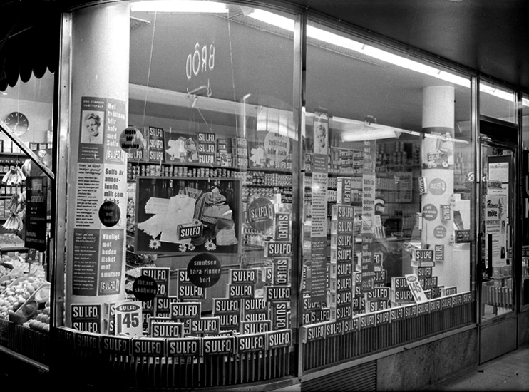 Konsum, skyltfönster med tvättmedel Sulfo.