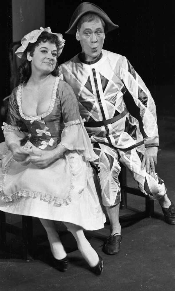 Två skådespelare, en kvinna och en man, agerar i ett lustspel på Hjalmar Bergmanteatern. De är klädda i 1700-talsinspirerade kläder och sitter tillsammans på en bänk på scenen. Skådespelerskan är klädd i klänning, hatt, strumpor och pumps. Hon håller i ett papper. Skådespelaren har jacka och byxor i rutigt material i Harlekinstil, svarta skor och en trekantig hatt på huvudet.