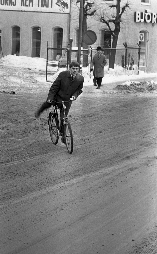 En man cyklar ut på gatan från ett hus med en skylt där det bl.a. står "Kem Tvätt." Han är klädd i rock och byxor. Det ligger snö på marken. I bakgrunden syns två personer som befinner sig på trottoaren.