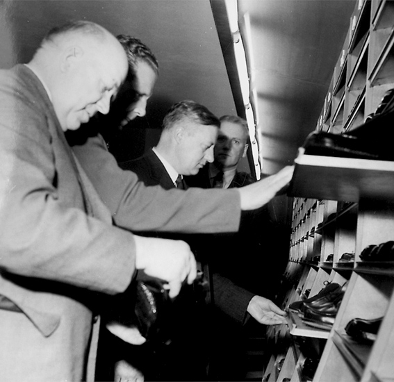 Konsum varuhuset, affärsinteriör, skoavdelningen, fyra män.
