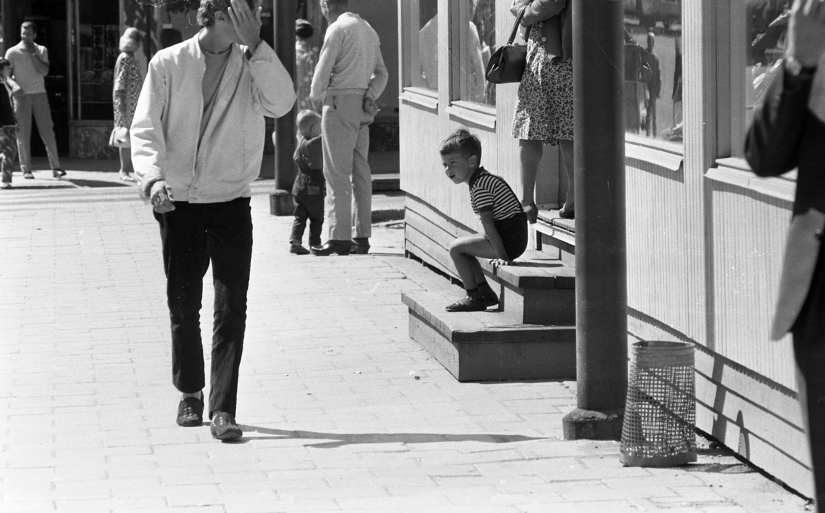 Ett antal människor befinner sig i centrala stan i Örebro. En ung man kommer gående. Han håller vänster hand framför ansiktet och är klädd vit jacka, ljus tröja, svarta byxor, vita strumpr och svarta skor. En liten pojke i fyraårsåldern klädd i svarta hängselshorts och randig T-tröja sitter på en liten trappa till höger. Ytterligare personer syns runtomkring.