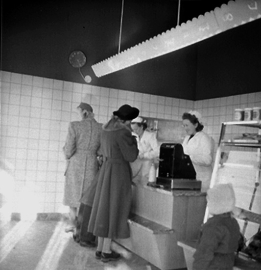 Titel: Konsum Rosta, brödbutiken, affärsinteriör, kunder och personal.