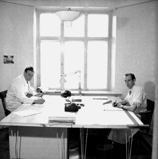 Ahréns Arkitektkontor, interiör, två män vid skrivbordet.