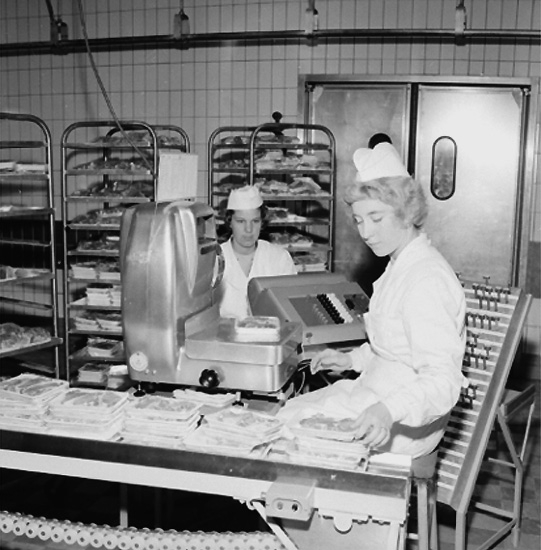 Konsum, charkuteriavdelningen, interiör, köttpackning, två kvinnor.