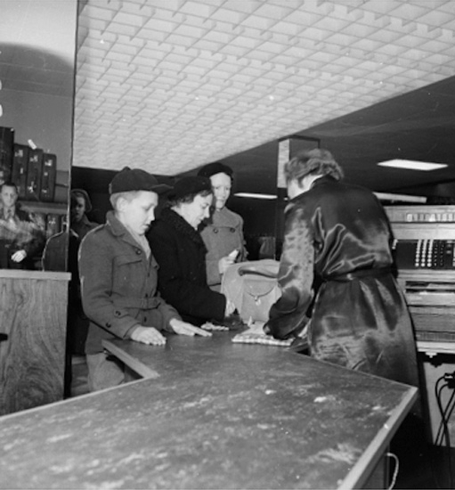 Konsum, affärsinteriör, kunder och personal.