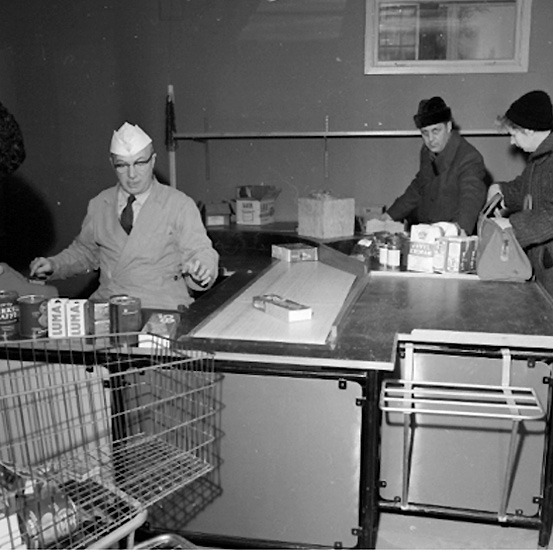 Konsum storköp, affärsinteriör, kassan, kunder och personal.