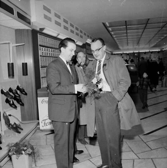 Titel: Oscarias nya affär, skoaffärsinteriör, kunder och personal.