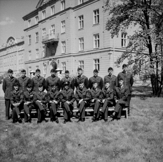 Kasernbyggnad i bakgrunden.