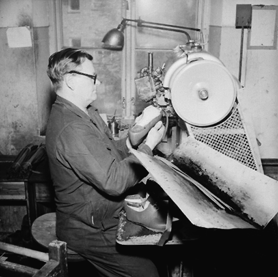 Titel: Oscaria Skofabrik, interiör, skotillverkning, en man.