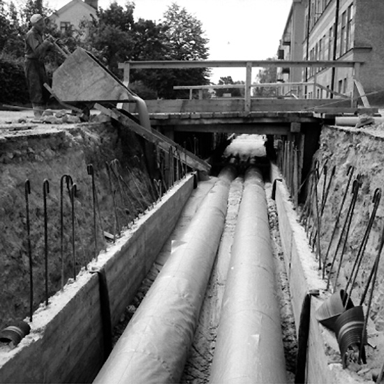 Pågående byggande av en cellbetongisolerad fjärrvärmekulvert vid Slottsgatan 39-41. Rördimensionen är 350 mm.