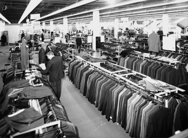 Titel: Konsum, affärsinteriör, herrekiperingsavdelningen, kunder och personal.