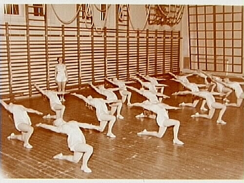 Arbetarnas gymnastikförening (A.G.F), två elitflickor, gymnastikövning, handstående.