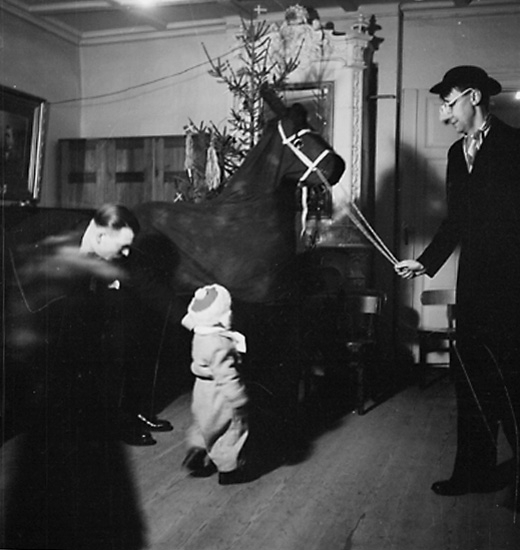 Underhållning, tre män (två av dem utklädda till häst) och en liten pojke.