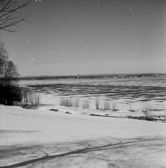 Titel: Vy. Åkermark i förgrunden, byggnader i bakgrunden.