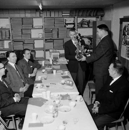 Rumsinteriör, grupp vid bordet, uppvaktning.