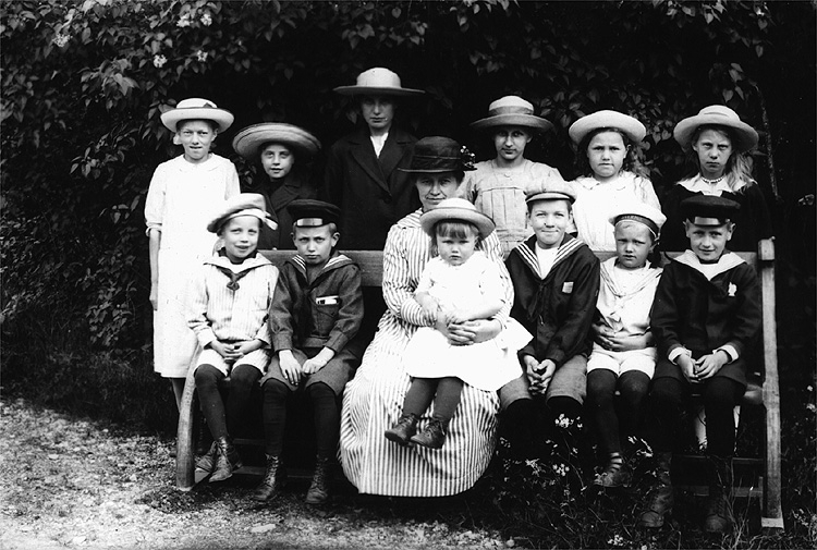 Bakre raden, 2:a och 3:a från vänster: Linnéa och Thea Elfrida Olsson. 1:a till vänster Mobergs dotter, Jenny Eriksson.