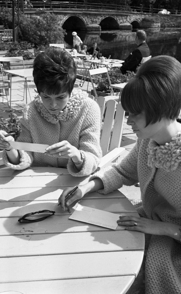 Två kvinnor i virkade långkoftor sitter vid ett bord på ett kafé nära slottet. De sitter med varsitt vykort framför sig och pennor i sina händer. I bakgrunden skymtar ytterligare kafébesökare, Kanslibron samt Svartån.
