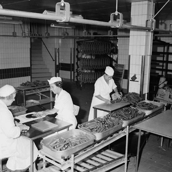 Konsum, charkuteriavdelningen, interiör, korvtillverkning, tre kvinnor.