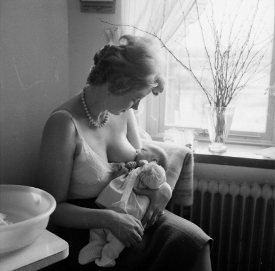 Titel: Rumsinteriör, en kvinna och en baby, amning. Plutt och Patrik.