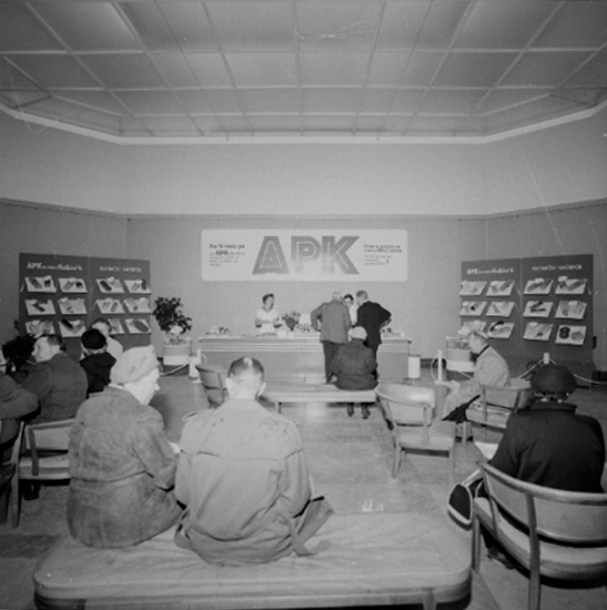 Titel: Utställning på Konsthallen, interiör, APK:s utställningsmonter (Kjellgrens Brödfabrik AB). "Kula" Karlsson