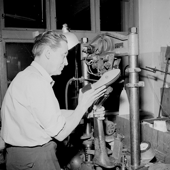 Titel: Oscaria Skofabrik, interiör, skotillverkning, en man.