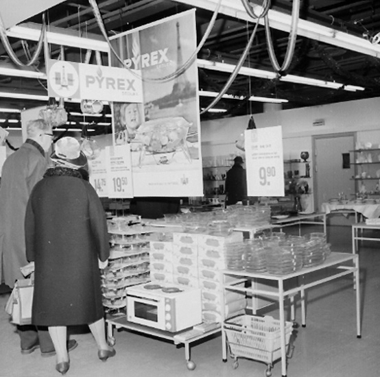 Titel: Konsum Domus, affärsinteriör, kunder och personal, demonstration av Pyrex-produkter.