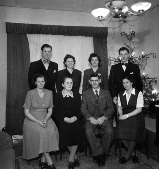 Rumsinteriör med julgran, släktgrupp 8 personer.