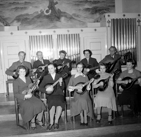 Kyrkointeriör, grupp 10 personer med musikinstrument.