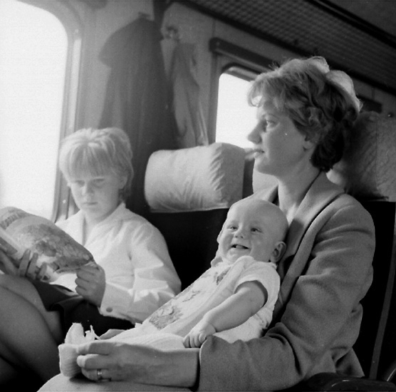 Titel: Familjeresan, en kvinna och två barn på tåget.