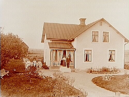 En och en halvvånings bostadshus, vinkelbyggt, med veranda. Ekonomibyggnad.