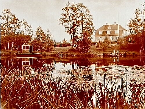 Tvåvånings bostadshus med frontespis, takkupor och brutet tak och trädgård vid Svartån.