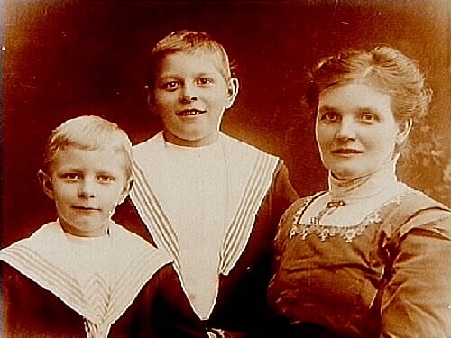 En kvinna och två pojkar, bröstbild.