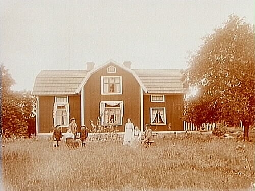 En och en halvvånings bostadshus med frontespis och brutet tak.