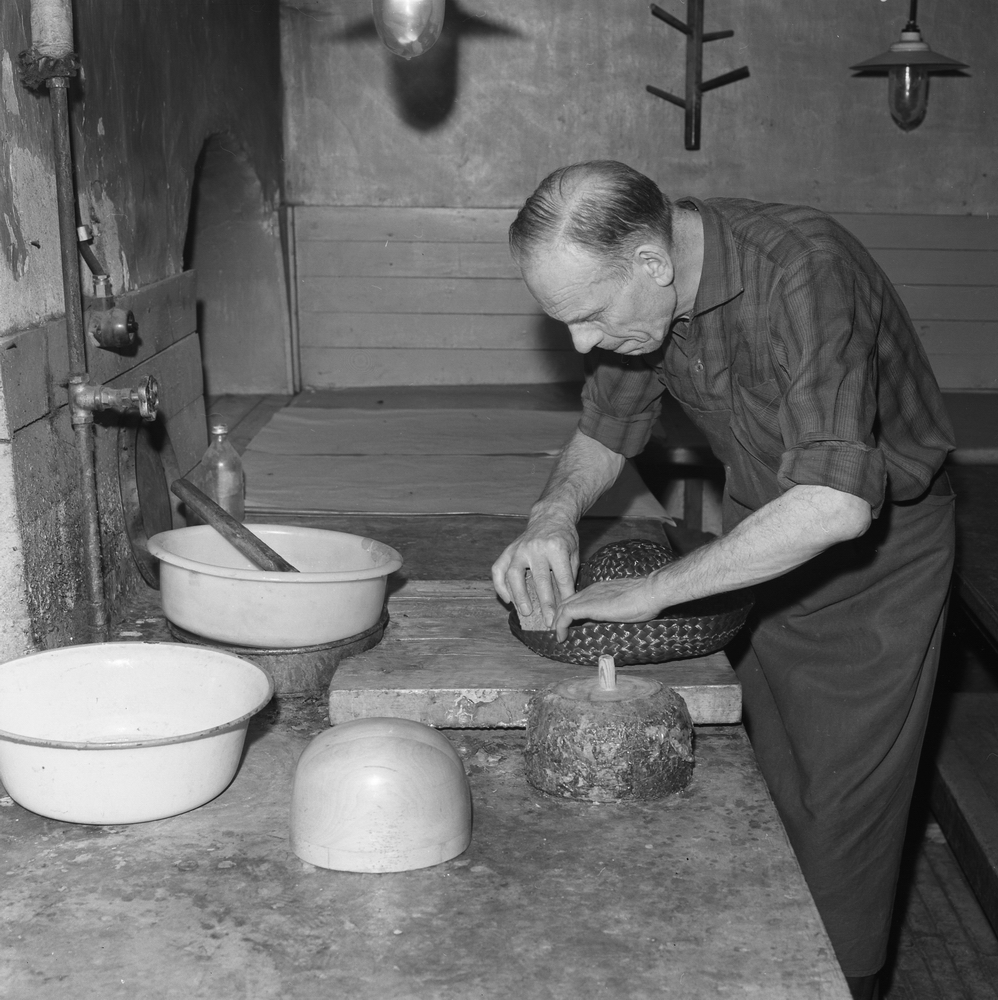 Hattillverkning. 204/67 Styvning av stråhatt. Svamp doppas i lim och strykes därefter på hatten. Hatten sitter på hattkulle av trä som i sin tur är placerad på en underställare.