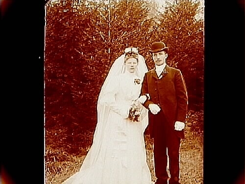 Brudpar, bruden helt i vitt, med krona, brudgummen i mörk kostym och plommonstop.