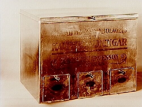 Plåtburk med tre lådor.
