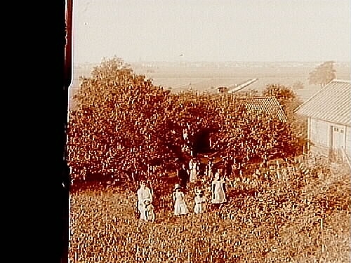 Titel: Stuga, grupp 11 personer framför stugan. Sam Lindskogs familjebild. Två bilder på samma glasplåt.